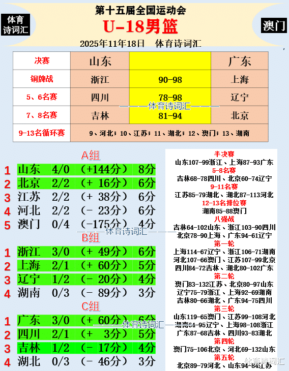本届U-18男篮大结局:1-2、待定;3、上海;4、浙江;5、辽宁;6、四川;7、北京;8、吉林;9、河北;10、江苏;11、湖北;12、澳门;13、湖南。